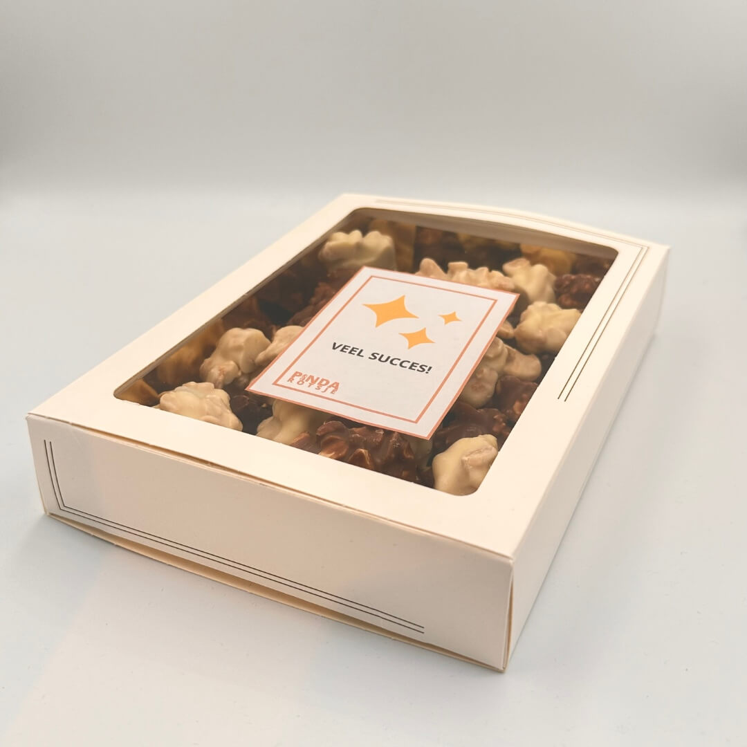 Op het punt om een grote stap te zetten of een nieuwe uitdaging aan te gaan, zoals een belangrijk examen, een nieuwe baan of een persoonlijke uitdaging? Geef jezelf of een dierbare een boost met ons motiverende cadeau, de Pindarotsjes 'Veel succes' van Pindarotsje. Kies uit melk, pure of witte pindarotsjes, of zelfs de mixverpakking!